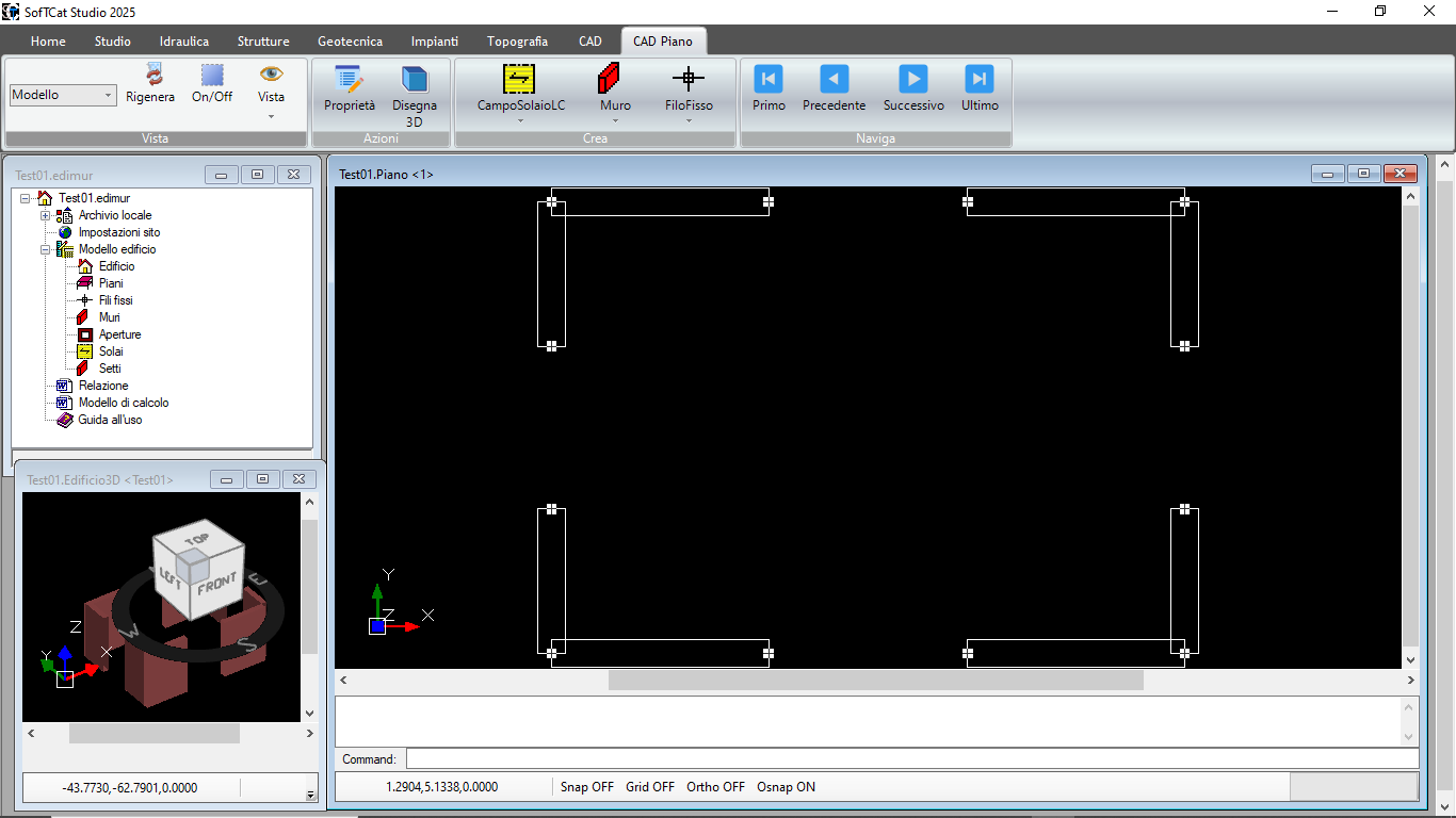 Input grafico con CAD interno che consente su di ogni piano caricare planimetrie in dwg dalle quali ricavare le murature esistenti o di progetto.
